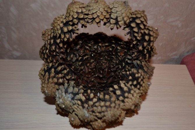 Основа корзиночки собирается из девяти шишечек одинакового размера. Желательно брать крупные, однородные, укладывая их «донышком» наружу – так конструкция выйдет интереснее. Когда круг замкнулся, к нему приклеивается еще ряд, но дно уже обращено внутрь, а деталей уже берется восемь. В следующем таком же ряду, частей потребуется всего семь, самое донышко выполнено из одной, самой крупной шишки, повернутой дном к «полу». Теперь приступают к выполнению ручки.