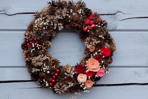 Еще одна поделка из шишек, которую можно сделать быстро и красиво своими руками, вы – это венок. При определенном декоре он может выглядеть как рождественский или осенник.