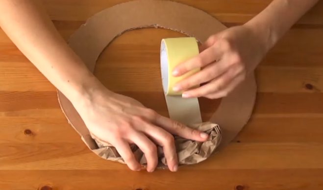 - Основу нужно сделать объемной. Для этого потребуется бумага и скотч. Бумагу нужно смять и прикрепить к основе.