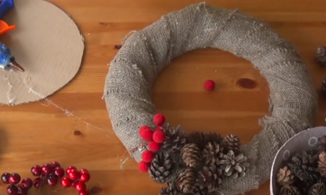 - Теперь можно клеить шишки. Важно посмотреть, как шишка будет лежать на основе и какой стороной прикасаться к ткани – именно на нее нужно наносить состав. Таким образом нужно заполнить всю основу сверху и по бокам. Также каждые 5 см можно крепить декоративные ягоды.
