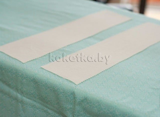 Вырезаем кусочки ткани с такой же высотой, а ширина должна быть в пять раз толще. Затем приклеиваем вдоль боковой линии ткань.