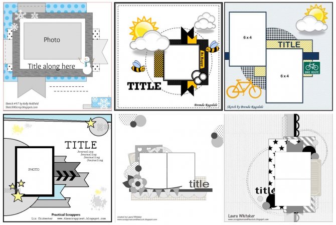 Чаще всего новичкам в скрапбукинге трудно расположить все элементы в нужном порядке на скрап-работе, так чтобы вся композиция смотрелась целиком, а не каждый элемент по отдельности, чтобы работа «дышала» и не была перегружена. Конечно есть скрап-мастерицы у которых композиция складывается легко и просто даже будучи новичком в скрапбукинге, но их единицы. Чаще всего видение композиции на этапе сборки приходит с опытом. И первое время очень помогают скетчи. Скетчи для скрапбукинга — это шаблоны (схемы, планы, зарисовки) в которых все элементы расположены в нужном месте. Подобная схема помогает расположить все элементы так, чтобы сложилась композиция и работа не была перегружена, было присутствие в работе «воздуха» (свободного пространства), надписи стояли в нужном месте, выделялись главные элементы в работе и были видны правильно расположенные слои.