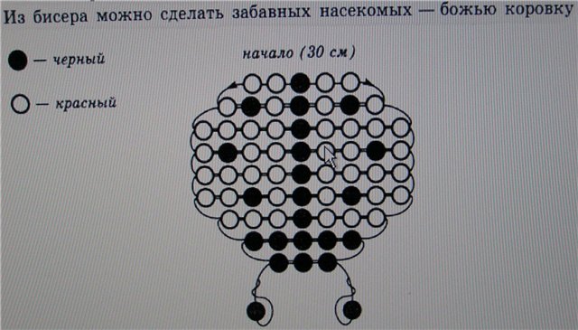 Простой способ изготовить объемную божью коровку позволяет нанизывание на проволоку. Для такой божьей коровки из бисера схему плетения необходимо составлять в натуральную величину. Техника проста: