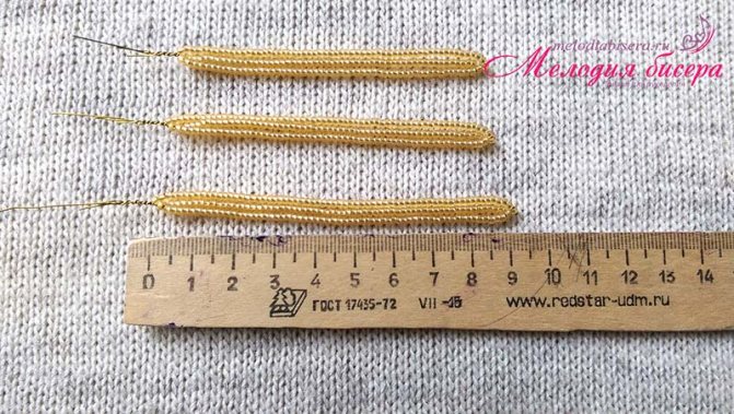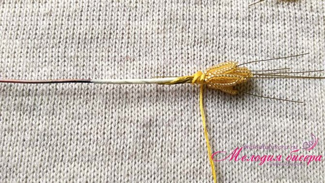 Делаем листик: берём отрезок проволоки длиной 12-13 см, делаем скрутку с рабочей проволокой. На ось набираем бисер, не доходя 5-7 мм до конца проволоки, делаем одну пару дуг. Для одного колоска делаем три листика.