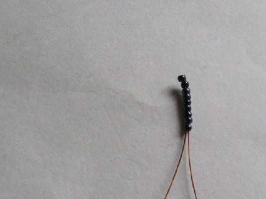 Когда все лепестки будут готовы, отодвигаем их в сторону, так как далее мы будем изготавливать тычинки. Для этого понадобится отрезок медной проволоки диаметром 0,25 мм и длиной 80 см. Набираем на нее 13 бисеринок черного цвета. Оставляем небольшой кончик длиной до 10 см. Придерживая набранные на проволоку бисеринки, отодвигаем первую из них в сторону и пропускаем другой конец проволоки через все остальные. Для того чтобы первая тычинка не распустилась, можно взять один из концов проволоки и пропустить его через последнюю бисеринку еще один раз. Затягиваем его — после этого тычинка уже не распустится. Таких заготовок понадобится 14 штук. Старайтесь делать так, чтобы расстояния между ними практически не было. Все тычинки у цветка должны располагаться вплотную друг к другу. Они могут получаться неодинакового размера из-за того, что сам материал бывает разным. Но внутри цветка это не будет слишком заметно. Откладываем заготовки в сторону.