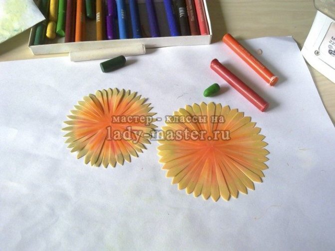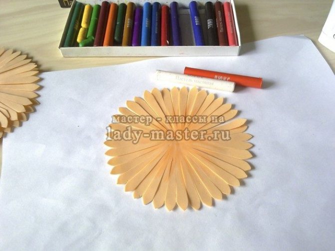Для сердцевинки вырежьте полоску длиной 25 см и шириной 2 см. Нужно нарезать на ней бахрому глубиной около 1 см, толщиной 1 мм. Затем подержать на утюге несколько секунд, немного покрасить красками и свернуть рулончиком, как на картинке.