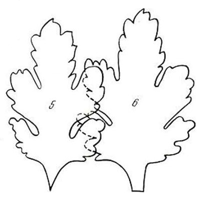 Для выкройки листа хризантемы сначала нарисуйте трилистник. Из верхней части нарисуйте еще три лепестка. Нарисуйте зубчики трилистника.