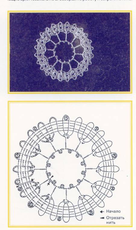 Во время выполнения второго круга ряда необходимо соединить все не провязанные внутренние арки двумя столбиками с тремя накидами, связанных вместе. Заканчиваем круговой ряд соединительным столбиком, связанным в 3-ю из 3 возд.пет., заменяющих первый столб. с накидом. Когда вязание будет готово, нить обрезать.