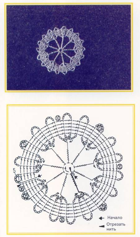 Перед началом заполнения мотива делаем возд.пет, а затем вяжем 9 раз: 1 столб. без накида 3 возд.пет. в начальную петлю; заканчиваем ряд соединительным столб. в первый столб. без накида, после чего вяжем дополнительный соед. столб. в первую арку.