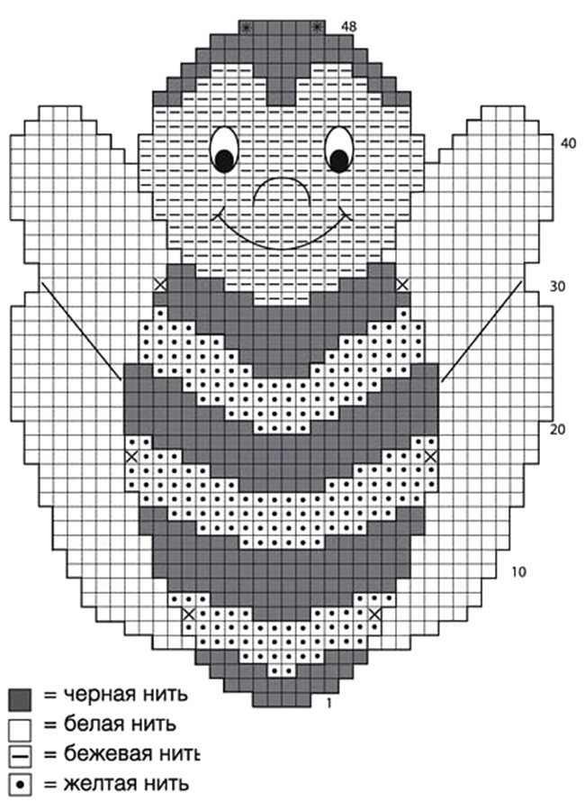 - Процесс создания пчелки начинается с работы инструментом большего диаметра. Главное изображение выполняется накидными столбиками согласно конфигурации, представленной выше.
