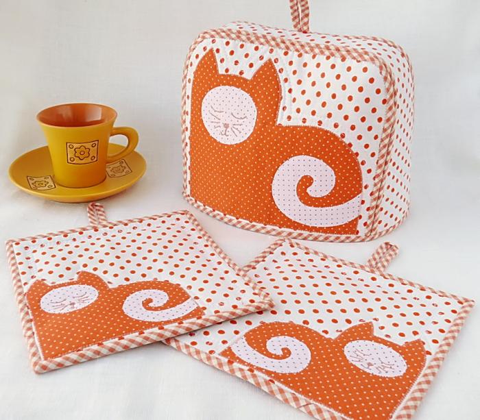 Любительницам оригинальных решений, нестандартных идей и эксклюзивных вещей придется по душе создание комплектов для кухни. Они состоят из прихваток, фартука, грелок на чайник и чашки, выполненные в едином стиле.