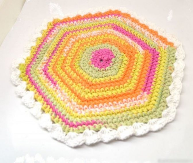 Наиболее простым способом вязания изготавливаются прихватки с цветными полосами