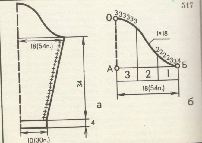 Пройма так же должна быть округлой формы с выпуклыми или вогнутыми закруглениями. Высота проймы должна соответствовать высоте оката фонарика. Выпуклые формы образуются путем последовательных прибавок. Вогнутые линии образуются после убавок петель и их закрытия в порядке, обратном набору.