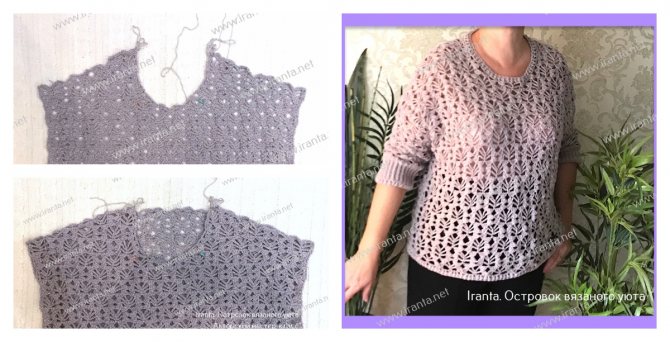 - с нижней части спины и передней части. Спина и грудь изделия вяжутся одинаково, прямыми полотнами с выбранным узором; Изменения в петлях начинаются только на уровне проймы;
