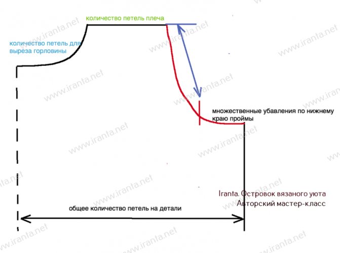 - От общего количества петель обязательно отнимаются звенья на плечи и вырез горловины;