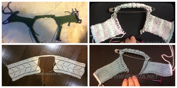 - При оформлении проймы нет необходимости вывязывать скругление. Вместо этого большие части изделия вяжутся прямыми, а часть петель переносится на вспомогательный инструмент.