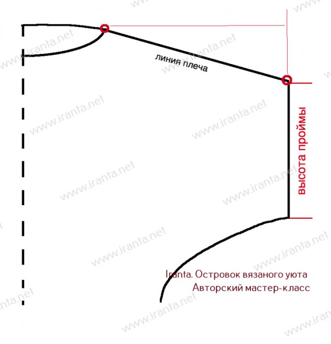 !!! Обязательно учитываем, что в готовом изделии к этой длине прибавится еще ширина обвязки горловины, т.е., к примеру, если нужно ВСЕГО от края горловины до края плеча 12 см, при этом ширина обвязки составляет 4 см, то длина плечевого шва соответственно – всего лишь 8 см. Не забываем также, что ЛЮБОЕ вязаное изделие обязательно немного растянется, в том числе и на плечах. Все эти тонкости должны быть изначально «заложены» в расчетах на формируемую пройму.