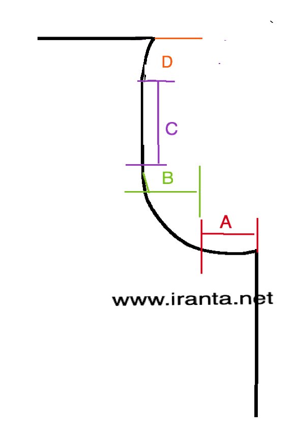В этом примере возьмем за основу вязание снизу вверх, т.е. убавляем петли. Порядок убавлений следующий: скругление проймы по нижнему краю за счет нескольких рядов множественных убавлений на отрезке А, затем небольшие убавления на более протяженном отрезке В и заканчиваем вертикальной линией без убавлений до плеча на отрезке С.
