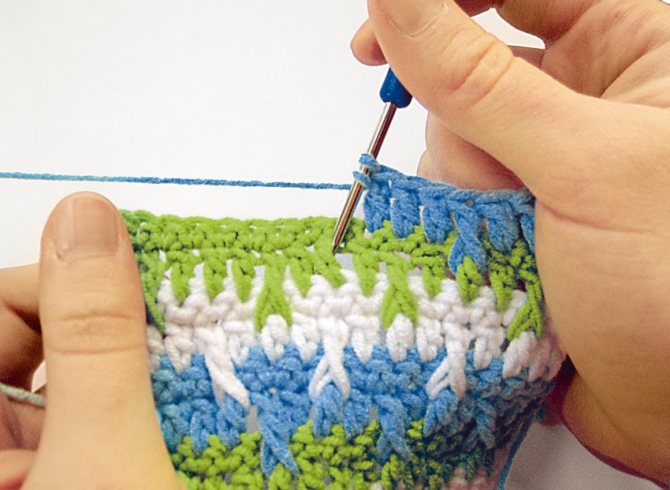 (рис. 3.4). Вяжут ее так: 2 ряда одним цветом, 2 ряда — другим и так чередуют, не обрывая нитей. По этому же принципу можно вязать и нитями трех и более цветов.