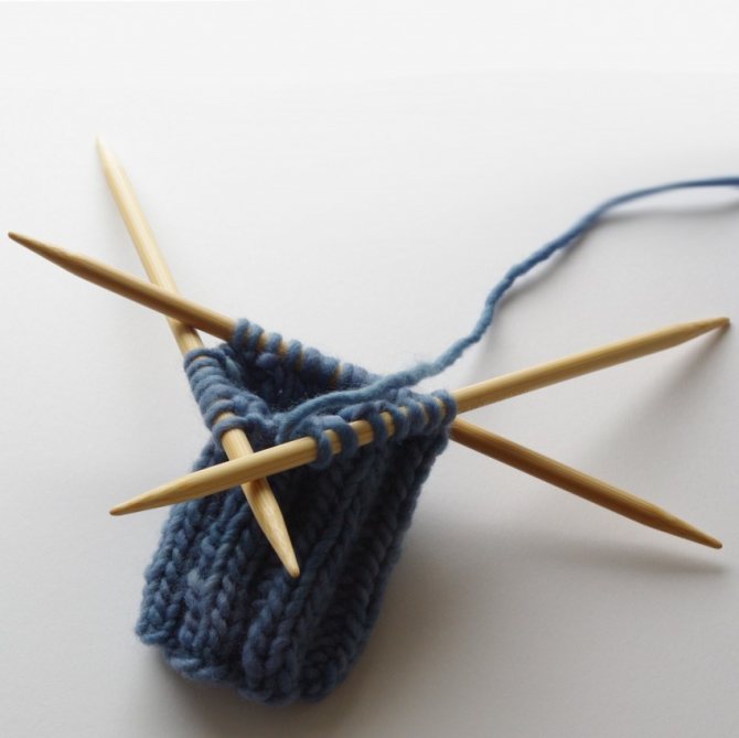 При вязании носков, варежек, юбок, джемперов на пяти или кольцевых спицах нет обратных рядов. При вязании на пяти спицах сначала набирают на две вместе сложенные спицы такое количество петель, какое предполагается вязать на одной спице, потом одну спицу вытягивают из набора, складывают ещё раз их вместе и набирают для второй спицы. Так же поступают и с третьей и четвёртой спицами. Когда набрано необходимое количество петель на 4 спицы, пятой спицей приступают к вязаниию по кругу.