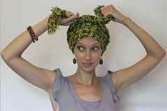 Один из наиболее красивых способов подразумевает использование шарфа или длинного платка. Форма их должна быть прямоугольной, а не квадратной, иначе завязать чалму таким способом будет невозможно. Платок надевается на голову, его концы сзади скручиваются в жгуты. После чего один выносится на переднюю часть головы, а далее также надо сделать и со вторым жгутом. Таким образом получится, что на голове платок и два жгута в виде косичек. Концы жгутов прячутся в задних слоях платка.