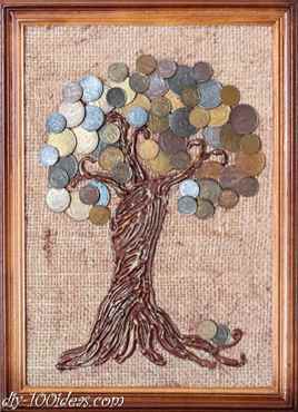 После берем монетки и термопистолет и приклеиваем монетки, как крону дерева в хаотичном порядке. Клеить монеты нужно в 2 яруса, чтобы картина была объемной.