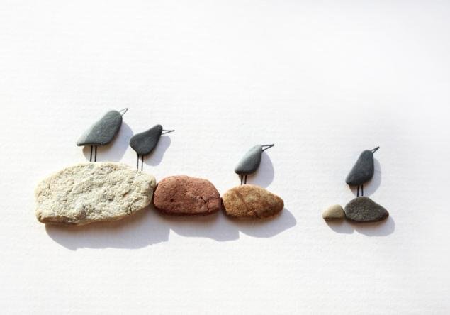В этой картине тоже присутствует веточка, но еще задействован и карандаш, им дорисовался клювик и ножки птички. Для этой картины понадобится всего 8 камушков. Два камушка для птичек, а остальные — как украшение ветки в виде листочков. Птичек можно приклеить и побольше, чем меньше камушки, тем большее количество птиц можно приклеить на картине. Если нет ветки, то ее можно нарисовать.