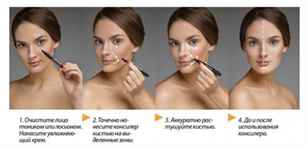1. Запрещается использовать консилер холодными пальцами.2. Сначала необходимо выдавить средство на тыльную сторону руки, а затем нанести на лицо.3. Перед началом работы необходимо очистить и увлажнить лицо, а также распределить тональное средство.4. Если у вас жирная кожа, обязательно при нанесении пользуйтесь кисточкой.5. Чтобы сделать оттенок консилера светлее и для более легкого нанесения, его нужно смешать с увлажняющим кремом.6. Запрещено использовать при поврежденной коже, например, если есть раны или ссадины.Схема нанесения для вечернего макияжа