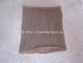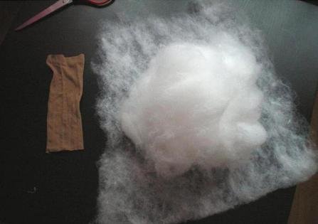 1 шаг: делаем голову. Для этого кусочек синтепона закладывают в капроновый мешочек. Другой кусочек синтепона вкладывают в этот мешок отдельно – примерно посредине – это будущий носик.