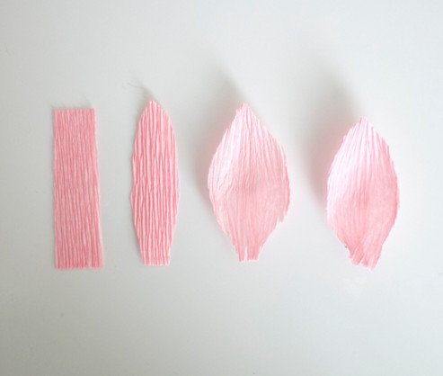 Начните с подготовки лепестков. Для этого вырежьте из цветной бумаги несколько прямоугольников размером 10 см на 15 см. Из одного прямоугольника вы получите один лепесток. Чтобы лепестки выглядели более реалистично, закруглите верхние края каждого прямоугольника.