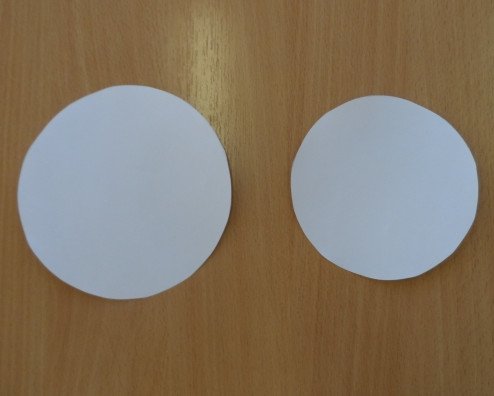 - Наша кувшинка будет объемной не только за счет пухлых лепестков, но и за счет двух их слоев. Поэтому надо вырезать два белых круга, различающихся друг от друга размером, но не сильно, измеряйте на глазок.