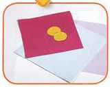 - Розовый и голубой квадраты со сторонами 12 см, а белый – 10. 2 желтых кружочка по 2,5 см каждый.