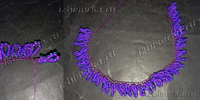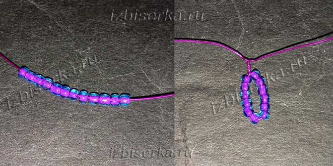Вся работа делается петельной техникой. Берём отрезок 200 см, нанизываем на него 12 бисеринок, располагаем их на 5 см от края и делаем петлю.