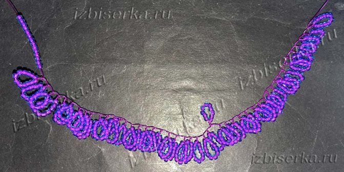 Далее на длинный конец проволоки набираем 10 бисерин и на расстоянии 2–3 мм от первой петли снова делаем петельку. Плетём 20 петель состоящих из 10 бисеринок каждая.