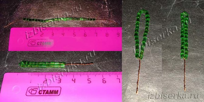 Берём 14 см проволоки, набираем на неё рубку, низка должна быть 7 см и делаем петельку. Потом плотно её сжимаем. Получился листочек длиною 3,5 см. Делаем таких листочков 2 штуки.