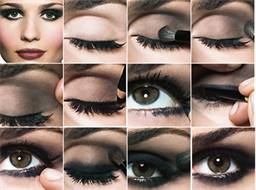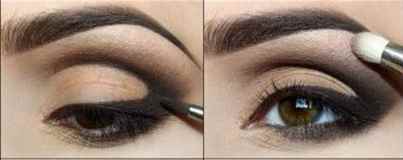 Под нижнее веко следует нанести кистью пудру. С помощью кисти наносят черные тени на подвижную часть верхнего века очень густым слоем. Нижнее веко следует подвести по линии роста ресниц тенями. После этого следует черным карандашом провести линию подводки обоих век. Чтобы придать яркости и добавить контраст, следует нанести светлые тени на область под бровями и растушевать границу с черным цветом. Затем надо нанести на ресницы тушь, и макияж готов.