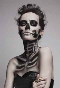 | Скелет | Белая и черная краска для лица, тонкая кисть, черный карандаш для глаз | 1. Нанести белый грим на все лицо. 2. Черной краской нарисовать «кости» на лице, имитируя череп: глазницы, нос, скулы, челюсть. 3. Черным карандашом для глаз прорисовать мелкие детали костей. |
