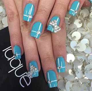 Нежно-голубой оттенок считается оптимальным для ежедневного использования. Для вечерних выходов лучше использовать наиболее яркие варианты этого цвета. Чтобы он не выглядел скучно, стоит его дополнить интересным дизайном с использованием камней. При этом он может вполне подходить к деловому стилю.