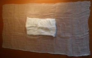 На середину куска марли положите ровный слой ваты размером 20 × 20 см, толщиной 1–2 см. С обеих сторон загните марлю по всей длине, накладывая на вату. Концы марли разрежьте на 25–30 см с каждой стороны для завязывания. Концы можно обшить.