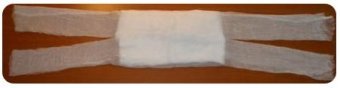 На середину куска положить слой ваты толщиной 2 см, длиной 30 см и шириной 20 см. Свободные от ваты концы марли по всей длине куска с обеих сторон завернуть, закрывая вату. Концы марли (30-35 см) с обеих сторон разрезать посредине ножницами, образуя две пары завязок. Завязки закрепить стежками ниток (обшить).