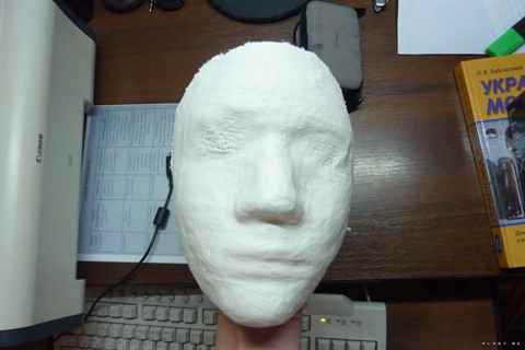 Для сохранения параметров, бровей, носа, губ и подбородка делаем на 2 мм потоньше, а глазные дырки, носовые и рот пошире. Затем все огрехи следует загладить перед работой с папье-маше.