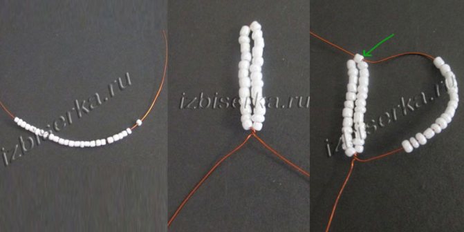 Берём отрезок проволоки длиной 28 см, набираем 25 белых бисерин. Расположив бисер на 10 см от края делаем петельку. На рабочий конец проволоки нанизываем нужное количество бисера и пропускаем его через центральную бисеринку.