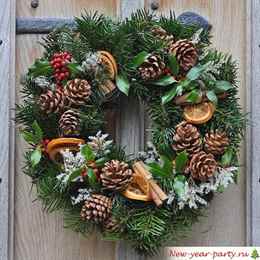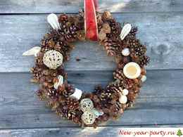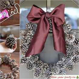 | Готовый венок из виноградной лозы | Прикрепление шишек клеевым пистолетом, декорирование лентами, бусами | Удобный, прочный, красивый. Может быть дороже других вариантов. |