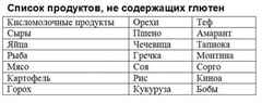| Прочие | Яйца, картофель, сладкий картофель, тапиока | Соусы, приправы и другие продукты, содержащие глютен (проверять этикетки!) |