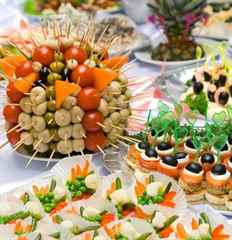Канапе, овощные и мясные нарезки, сырные тарелки, брускетты, рулетики, мини-сэндвичи, пирожки, мини-шашлычки, тарталетки, валованы, киш, салаты, хлебные палочки и крекеры с соусами и паштетами. Салаты и закуски эффектно подаются в фужерах или рюмках, в корзинках из теста и даже профитролях.