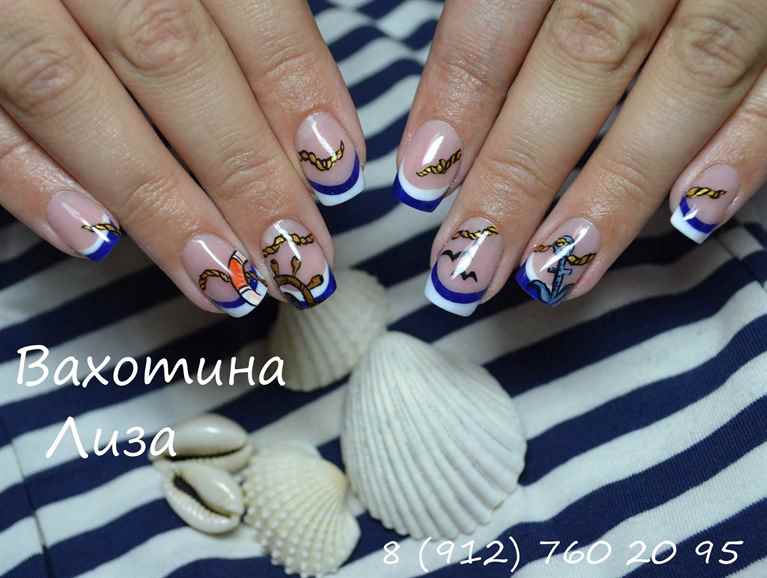 | Тематический морской | Якоря, спасательные круги, полоски, ракушки, морские звезды, дельфины, рыбки, изображенные на ногтях. | [Ссылка на фото с морскими элементами на ногтях] |