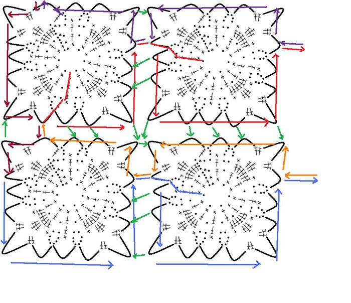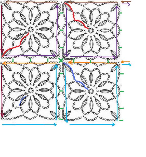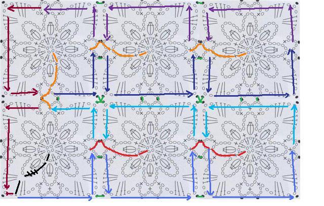 Пояснения: Последний ряд первого мотива вяжете по синей стрелке. На правой стороне первого мотива вяжете три полные арочки и половину четвертой арочки. Отсюда вам надо перейти на следующий мотив. Для этого надо связать половину арочки ( не знаю сколько у вас там будет петель ) плюс 10 петель плюс 6 петель для центрального круга. Место расположения цепочки перехода обозначено на схеме синей чертой. Далее вяжете второй мотив, вплетая в него цепочку перехода, при необходимости поднимаясь по ней. Закончив предпоследний ряд, оставляете справа цепочку равную половине арочки ( у вас два мотива будут соединены цепочкой равной полной арочке, которая пока остается болтаться ) и вяжете половину третьей арочки, крепитесь к первому мотиву по зеленой стрелке соединительной петлей, вяжете опять половину арочки, крепитесь к нужному месту текущего мотива. Вяжете далее по синей стрелке до места перехода на следующий мотив. Как и ранее переходите на следующий мотив, вяжете необходимое количество мотивов в длину. Последний в ряду мотив вяжете полностью по оранжевой стрелке. Переходите на следующий мотив, прикрепляясь к арочке, которая у вас болтается. Таким образом закрываете верхнюю часть всех мотивов. По оранжевой стрелке переходите на второй ряд мотивов. Красной чертой отмечена цепочка перехода. Количество перель в цепочке перехода не меняется. По красной стрелке вяжете последний ряд второй полосы мотивов, не забывая провязывать крепления по зеленым стрелкам. Довязываете верхнюю часть мотивов по фиолетовой стрелке. Связав нужное количество мотивов в высоту, закрываете левую сторону всех мотивов по бордовой стрелке. Вроде бы все. С УВАЖЕНИЕМ natulechka72, Т.Е. НАТАЛЬЯ GRAF.