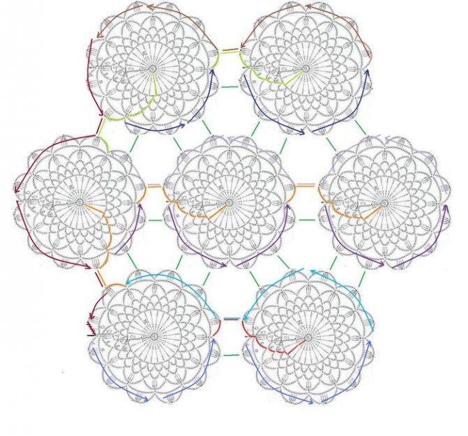 Пояснения: Первый мотив — нижний левый. Черной черточкой на нем обозначено место начала вязания последнего ряда. В последнем ряду первого мотива вяжем 6 лепестков по синей стрелочке, затем переходим на следующий мотив. Для этого вяжем цепочку перехода, которая состоит из 35 возд. петель плюс 10 петель для центрального круга. Цепочка перехода обозначена красным цветом. Замыкаем в круг 10 петель, поднимаемся по цепочке перехода на 3 петли, вяжем первый ряд, поднимаемся по цепочке перехода на 5 петель, вяжем 2 возд. петли, продолжаем вязать второй ряд по схеме, после последнего в ряду столбика с 3-мя накидами, вяжем 1 возд. петлю и крепимся во вторую петлю цепочки перехода. Цепочку перехода оставляем справа, вяжем арочки третьего ряда, для последней в ряду арочки вяжем 2 петли и крепимся в третью петлю цепочки перехода. Четвертый ряд вяжем аналогично третьему. В пятом ряду опять оставляем справа цепочку перехода, вяжем лепесточки. Для последнего в ряду лепестка вяжем 5 возд. петель, 3 столбика с 2-мя накидами с одной вершиной и крепимся в шестую петлю цепочки перехода. Поднимаемся на одну петлю по цепочке перехода, вяжем 6-ой ряд. Опять оставляем справа цепочку перехода, от которой к этому моменту должно остаться 14 петель и которая пока останется болтаться, вяжем последний ряд. Для первого в этом ряду лепесточка вяжем 7 возд. петель, 4 столбика с 2-мя накидами с одной вершиной, крепление к предыдущему мотиву, 7 возд. петель. На схеме места крепления между мотивами обозначены зелеными черточками. Далее вяжем еще 5 лепесточков по синей стрелочке и переходим на следующий мотив. Так вяжем 6 мотивов ( судя по раскладке ) или нужное количество мотивов в длину. Последний в ряду мотив провязываем полностью, т.е. после синей вяжем по голубой стрелочке. Последний лепесток вяжем так — 7 возд. петель, 4 столбика с 2-мя накидами с одной вершиной, крепление к той цепочке перехода из 14-ти возд. петель, которая у нас осталась болтаться между мотивами. Далее довязываем последний ряд уже предыдущего мотива опять же по голубой стрелочке и так до самого первого мотива. Теперь переходим на второй ряд мотивов. Цепочка перехода обозначена оранжевым цветом. Последний ряд мотива вяжем по фиолетовой стрелочке, не забывая провязывать крепления теперь уже и к нижнему ряд мотивов. В этом ряду мотивов должно быть на один больше, чем в предыдущем. Довязываем последние ряды всех мотивов по сиреневой стрелочке. Далее вяжем опять на расширение, т.е вяжем как второй ряд мотивов и цепочка перехода будет расположена как во втором ряду. Так вяжем до тех пор, пока в ряду будет 11 ( судя по раскладке ) мотивов. А вот дальше нам надо вязать на уменьшение. Смотрим по схеме на третий ряд мотивов. Цепочка перехода обозначена салатовым цветом. Последний ряд мотивов вяжем по темно-синей стрелочке, не забывая провязывать крепления, довязываем мотивы по коричневой стрелочке. Вяжем как третий ряд до тех пор, пока в ряду будет столько же мотивов, как и в самом первом. Поворачиваем вязание на 90 градусов и по бордовой стрелочке довязываем левую сторону всех мотивов. На первом мотиве над черной черточкой я обозначила столбик с 5-ю накидами, т.е. вместо 7 возд. петель провязываем вышеобозначенный столбик. Все. Можно, не отрывая нитку, вязать обвязку. Djv юбезно поделилась вязанием схемы и к этому очаровательному пла