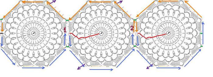 Пояснения: На первом мотиве слева черной черточкой обозначено место выхода на последний ряд. Последний ряд вяжем по синей стрелке до точки 1. В этом месте надо перейти на следующий мотив, для этого вяжем цепочку перехода, которая состоит из 24-х петель плюс 8 петель для центрального круга. Мотив вяжем по схеме. В начале рядов, в которых есть столбики с одним накидом, поднимаемся по цепочке перехода на три петли и далее вяжем ряды по схеме. В ряду со столбиками без накида поднимаемся по цепочке перехода на одну петлю и опять же вяжем по схеме. В ряду, где вяжутся столбики с тремя накидами с одной вершиной — поднимаемся по цепочке перехода на четыре петли, заводим крючок в пятую петлю, провязываем еще два незаконченных столбика с тремя накидами и одно петлей закрываем два столбика и цепочку. Далее цепочку перехода оставляем справа от вязания и вяжем ряд по схеме. Связав последнюю в ряду «шишечку», вяжем две петли и крепимся к третьей петле цепочки. Далее опять оставляем цепочку справа, вяжем ряд по схеме, а последнюю в ряду арочку вяжем так — три петли, крепление в четвертую петлю цепочки. Поднимаемся на одну петлю ( от цепочки перехода остается одна петля, которая служит соединительной петлей между мотивами ), вяжем последний ряд. Зелеными черточками обозначены места крепления к предыдущему мотиву. Вяжем последний ряд по синей стрелке до точки 2. Здесь опять вяжем цепочку перехода и, как описано выше, вяжем второй мотив. Вяжем до нужной длины. Если необходимо замкнуть полосу мотивов в круг, провязывая последний ряд последнего мотива, крепимся к первому мотиву, в местах обозначенных зелеными черточками. Далее последний ряд последнего мотива провязываем полностью ( по оранжевой стрелке ). В точке 2 переходим на предыдущий мотив и также довязываем последний ряд по схеме. И так вяжем каждый мотив до самого первого.