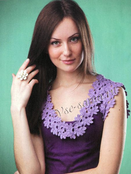 Невероятно красивыми являются изделия из ирландского кружева. Для его изготовления вяжутся прекрасные мотивы разных форм и размеров. Это могут быть цветы, листочки, звездочки, снежинки, вензеля ракушки, шнуры или любые фантазийные изображения. Затем эти вязаные элементы объединяются сеткой. Вещи, декорированные ирландским кружевом, выглядят превосходно.